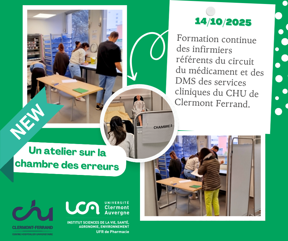 Espace dédié aux erreurs relatives au circuit du médicament, à l'hygiène et à l'identitovigilance : Prescription et iatrogénie informatique ; préparation des doses / modalités d'administration ; stockage des médicaments dans l'unité de soins ; traitement personnelCapacité : 15 personnes